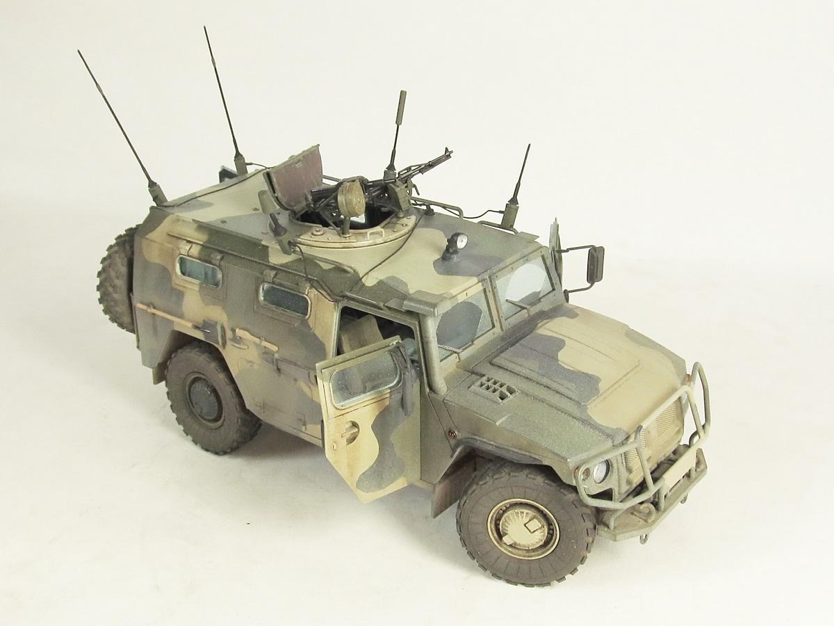 Из доработок: рассверлены стволы АГС-17 и пулемёта, выхлопную, сделана проводка к антеннам, заменены фары на крыше на Эльф, в зеркала вклеена зеркальная фольга.