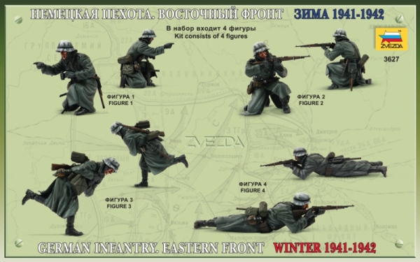Набор из 4 фигурок пехотинцев вермахта, экипированных на зимний период 1941-1942 годов, вооружённых пистолетом-пулемётом MP-38 и карабином 98k. Один из пехотинцев переносит боекомплект для 50-мм миномёта.