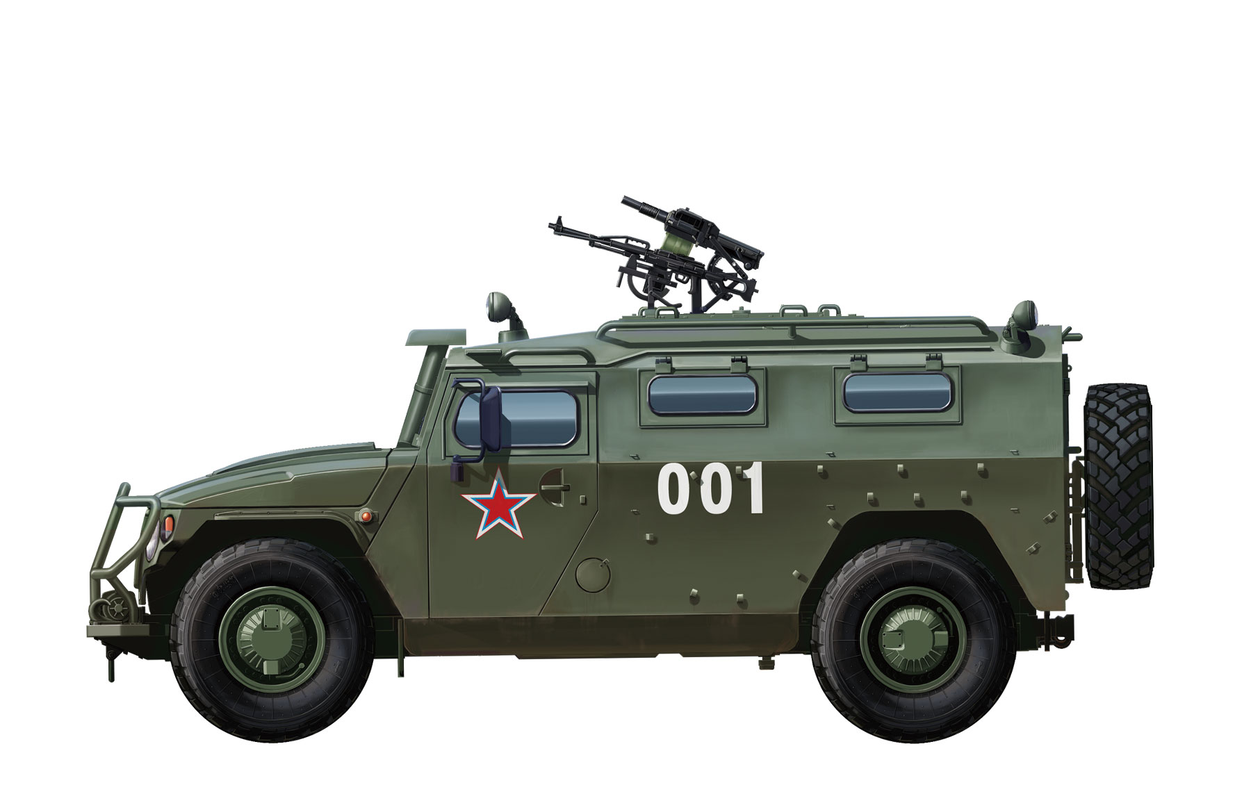 ГАЗ-233014 - это военный вариант многоцелевого внедорожника ГАЗ-2330 "Тигр", который прозвали “российским Хамви” из-за сходства с американским аналогом. Поступил на военную службу в 2007 году. “Тигр” способен развивать скорость по бездорожью до 120-140 км/ч благодаря своей конструкции. Экипаж из шести человек включает водителя, штурмана и 4 солдата спецназа. Вооружение состоит из установленного на крыше станкового автоматического гранатомета АГС-17 калибра 30 мм и 7,62-мм пулемета “Печенег”, которые можут одновременно управляться двумя членами экипажа через открытый люк. В салоне также может разместиться большой склад боеприпасов и гранатометов.