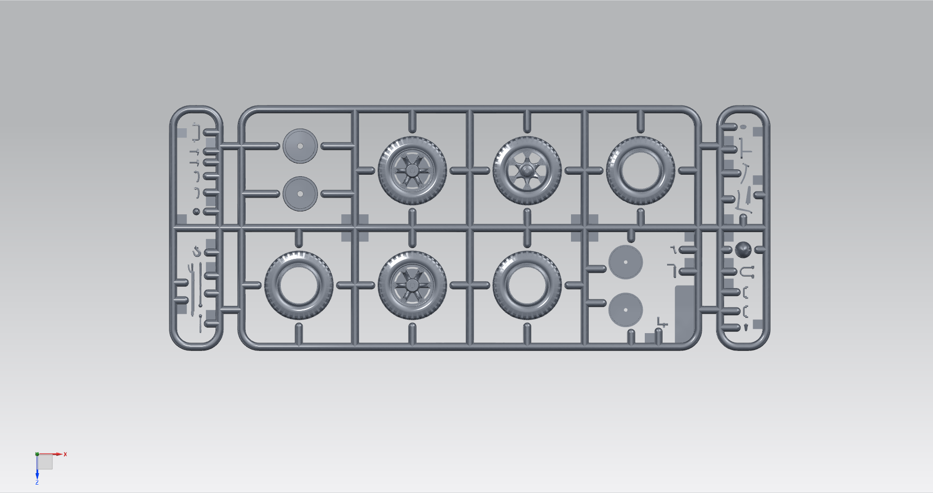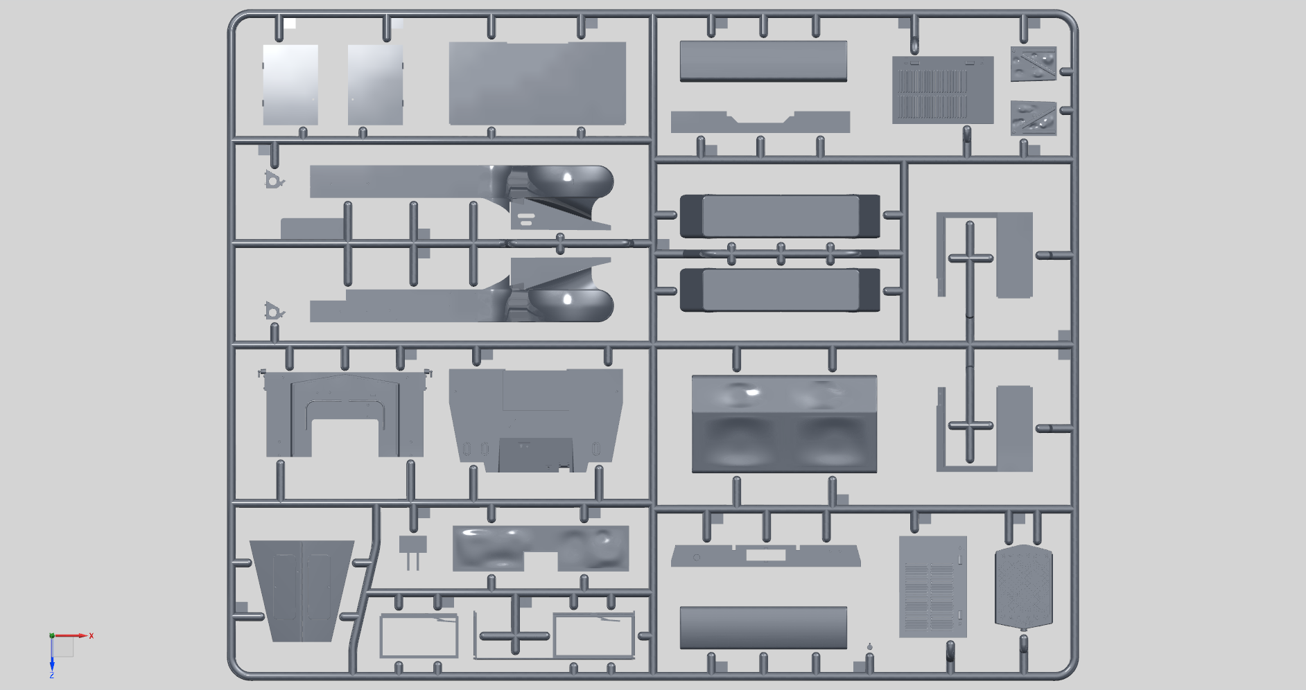 Высокодетализированный сборный двигатель, детально проработанное подкапотное пространство, выхлопная система выполнена отдельной деталью, створки капота выполнены отдельными деталями и на выбор открыты или закрыты.