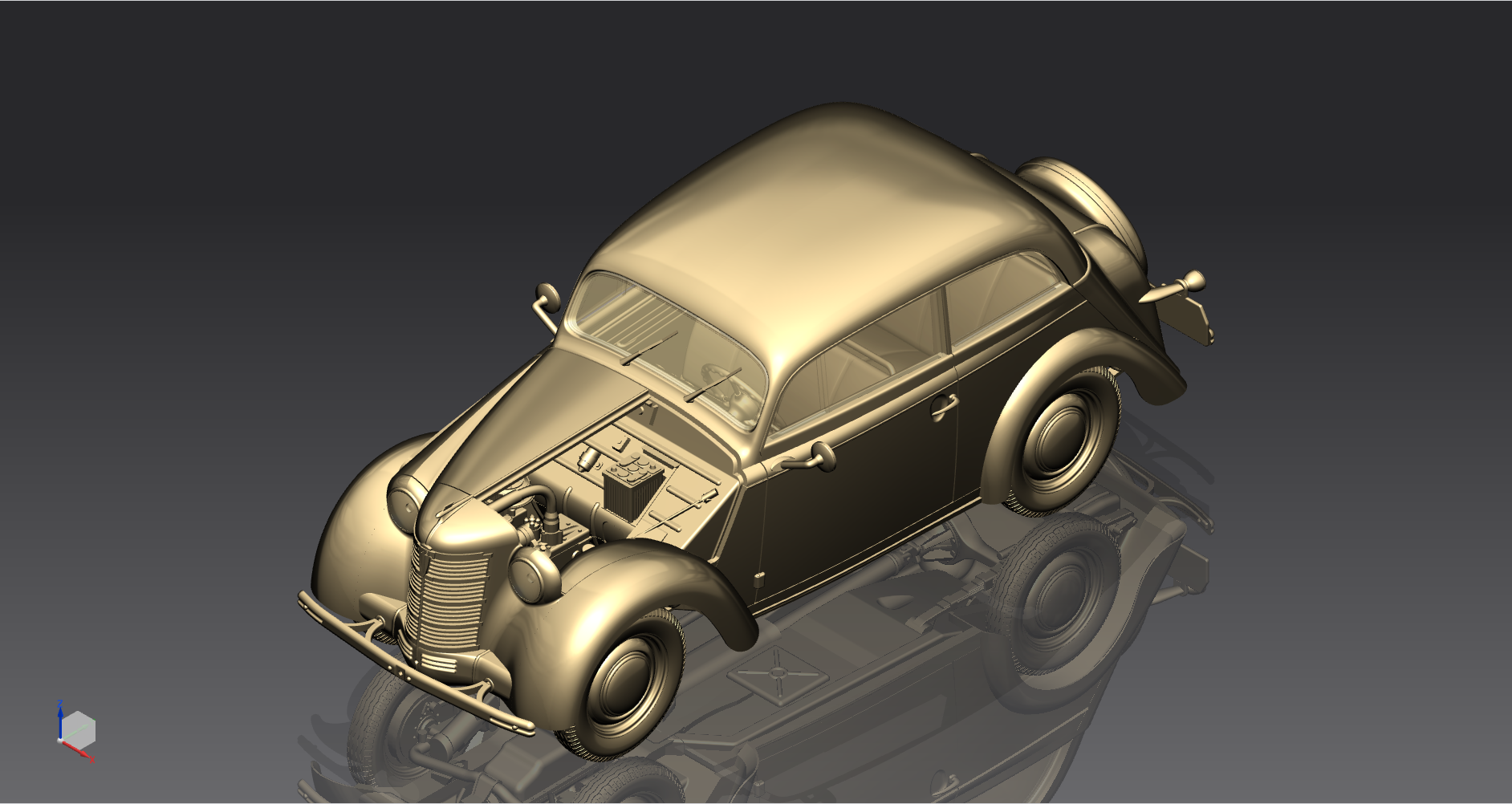 Высокодетализированный сборный двигатель, проработанное подкапотное пространство, капот выполнен отдельными деталями.