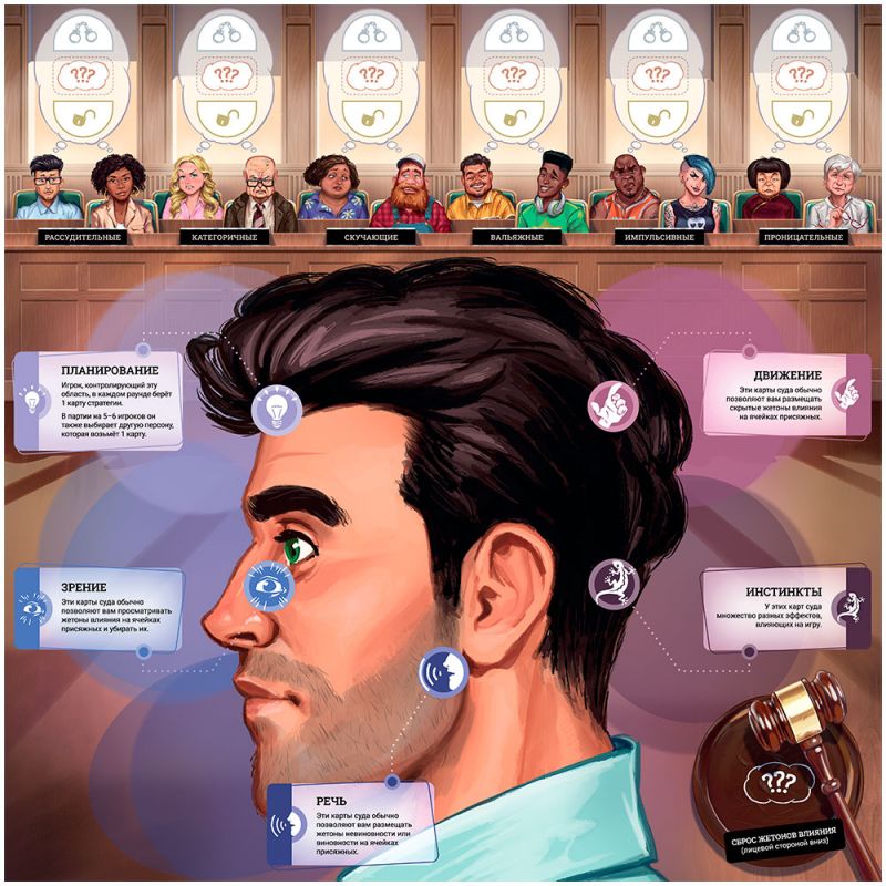"Голоса в голове" – это настольная игра для компании от 3 до 6 человек с асимметричными тайными ролями. Ну, или почти тайными, ведь один из игроков берёт на себя роль прокурора, чьей задачей является доказать вину Гая Джонсона, в то время как остальные игроки выступают голосами в голове подсудимого, и каждый из голосов преследует свою цель, о которой кроме самого игрока не знает никто.