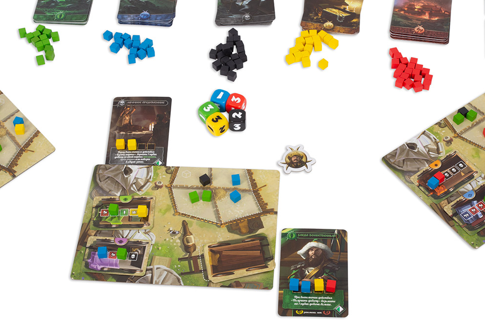 - Карты наёмников (зелёные) должны быть заполнены кубиками добычи, а затем они дают сильную постоянную способность. Однако незаполненные карточки отнимут победные очки в конце игры.