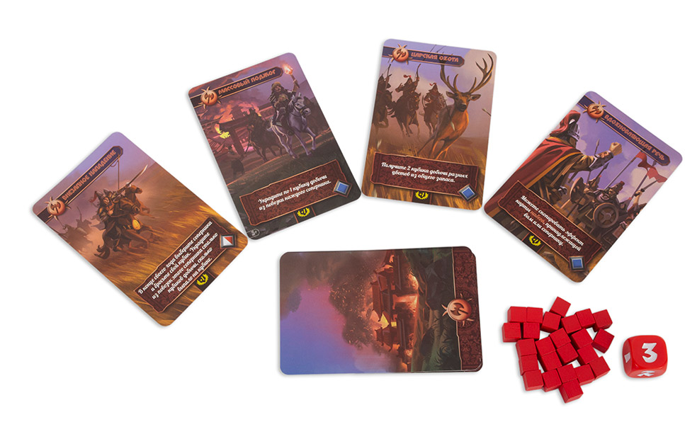 - Карты набегов (красные) позволяют один раз ограбить другого игрока. В конце игры приносят победное очко.