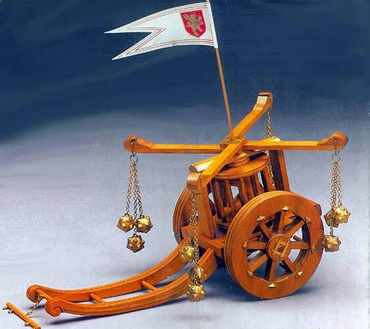 Гениальный изобретатель и художник Леонардо да Винчи выделялся разносторонними талантами. Ум его не ограничивался какой-либо одной творческой деятельностью, и ему было тесно в рамках существовавших на то время технических достижениях. С гениальным инженером сотрудничали многие государи той эпохи, в частности ряд восточных владык, а именно египетский и турецкий султаны, которые вели друг с другом ожесточенную борьбу. Для одного из них Леонардо изобрел боевую колесницу, прообраз которой он почерпнул в одном из чертежей римской эпохи. Она использовалась для наступательных боев и имела косы по бокам, которые буквально прорезали вражеский строй, оставляя в нем широкие бреши. Ко всему прочему, косы вращались по оси, так что остановить их не могли никакие препятствия и горы отсеченных конечностей.